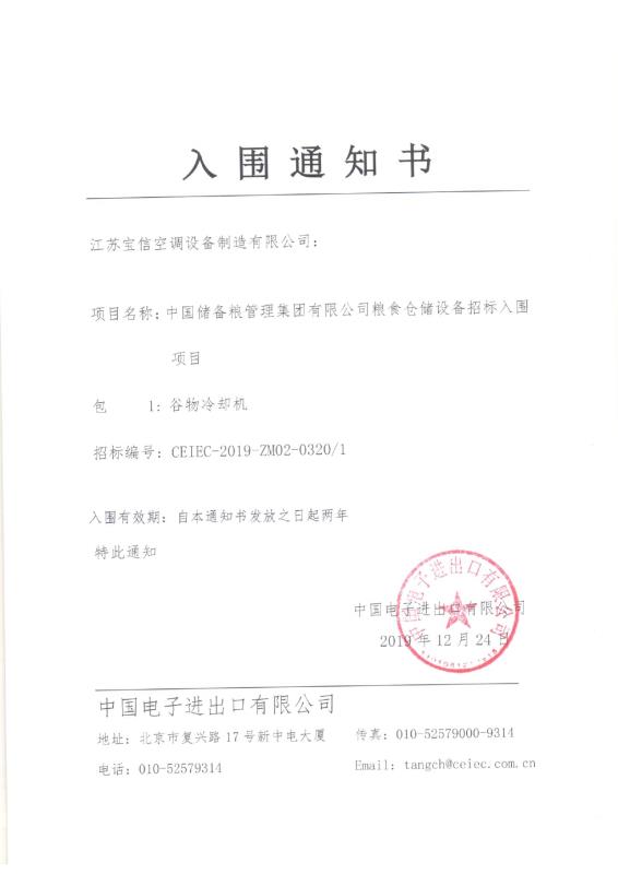 恭喜寶信空調入圍招標中國儲備糧管理集團有限公司糧食倉儲設備...